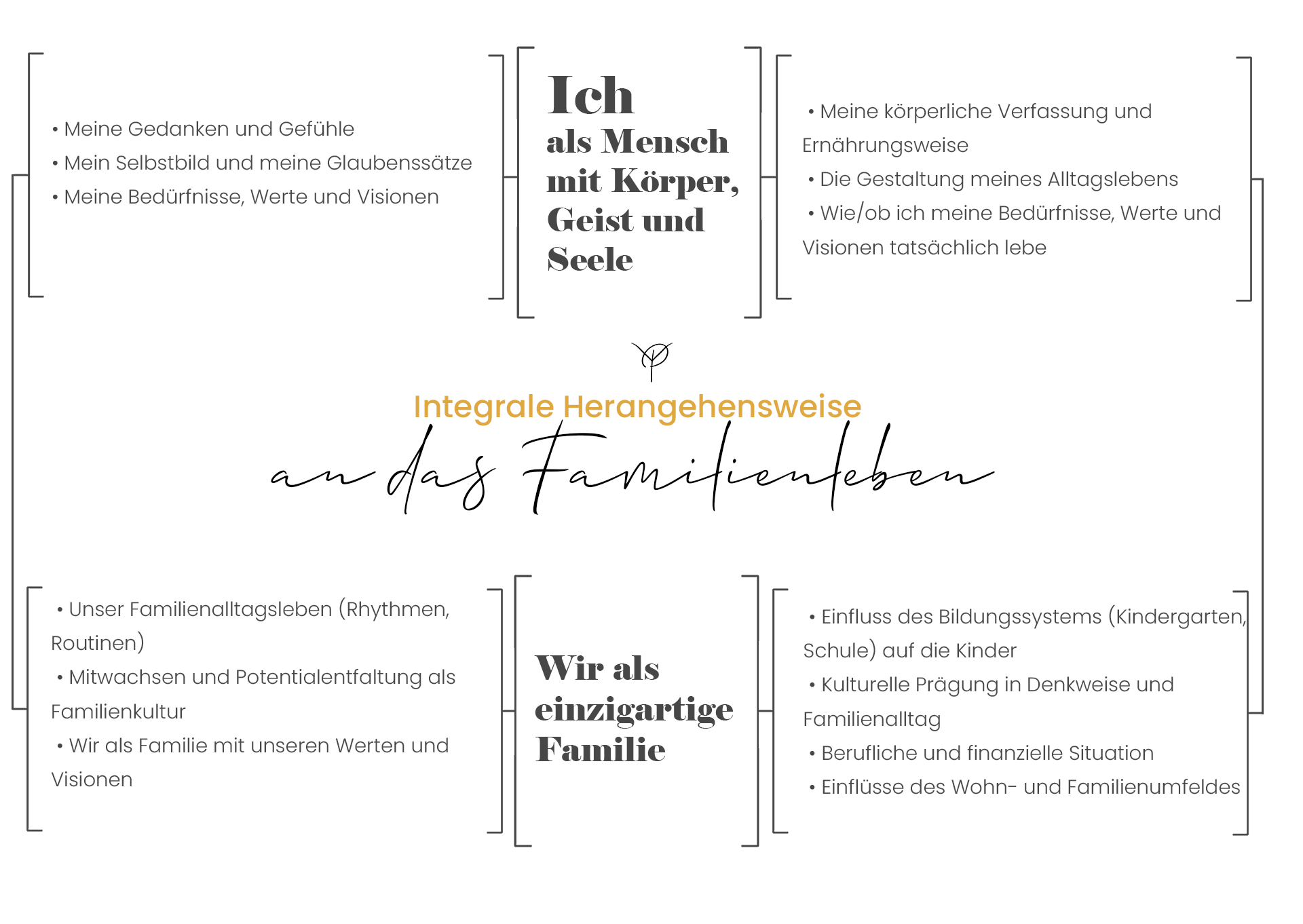 Eine Entfaltungs-Landkarte für Familien (integrale Herangehensweise). Innerhalb der Entfaltungslandkarte haben wir zwei zentrale Elemente ermittelt: Gesundes Familienalltagsleben und Mitwachsen statt Erziehen, die bei typischen Familienthemen häufig mit einbezogen werden.